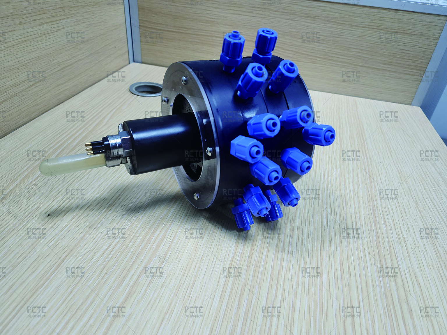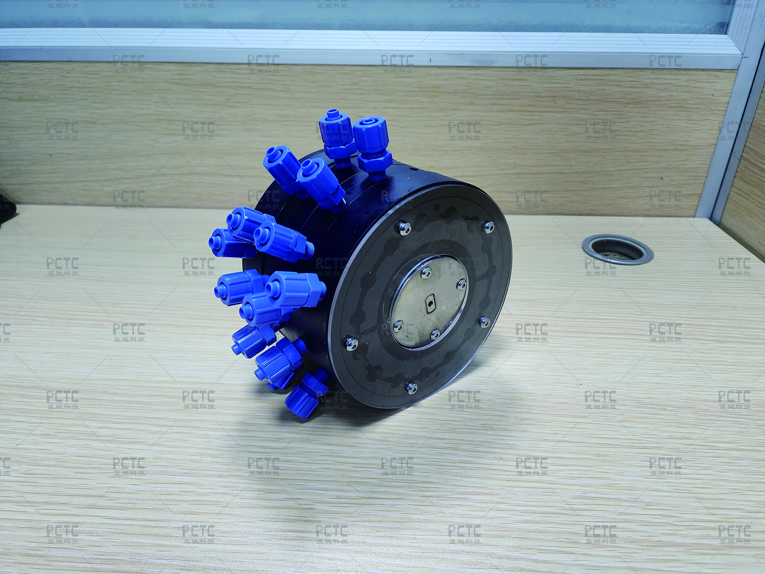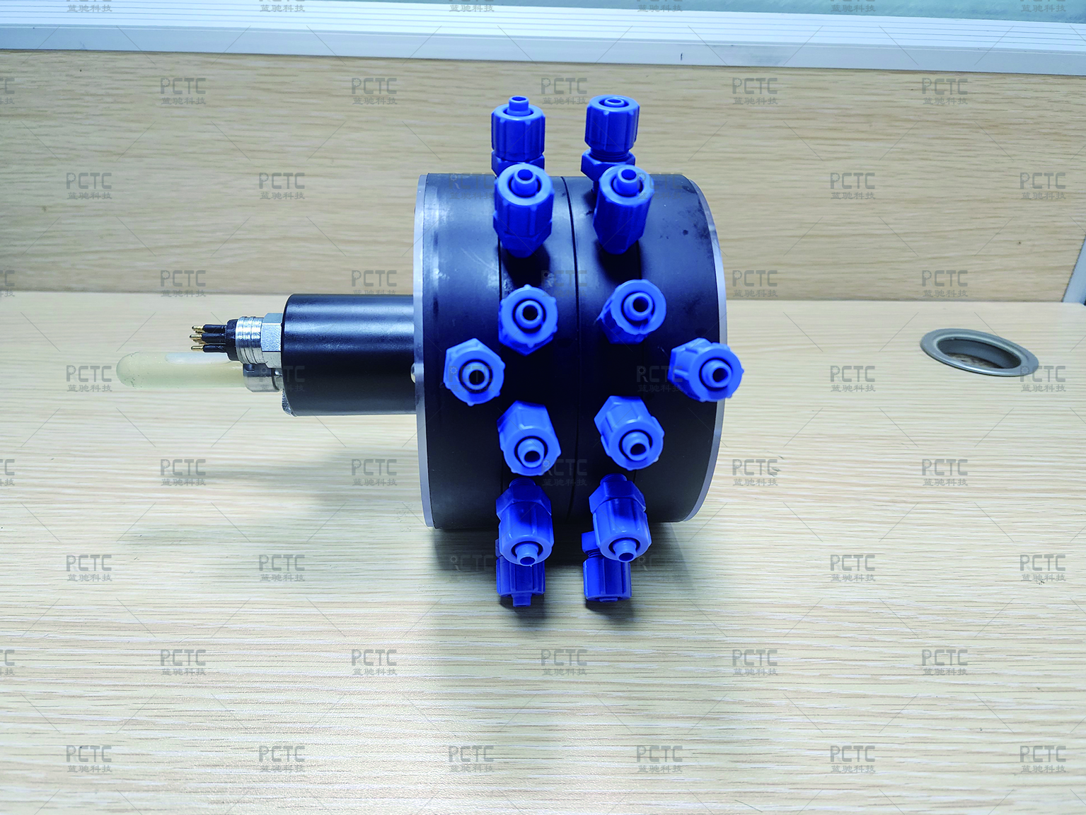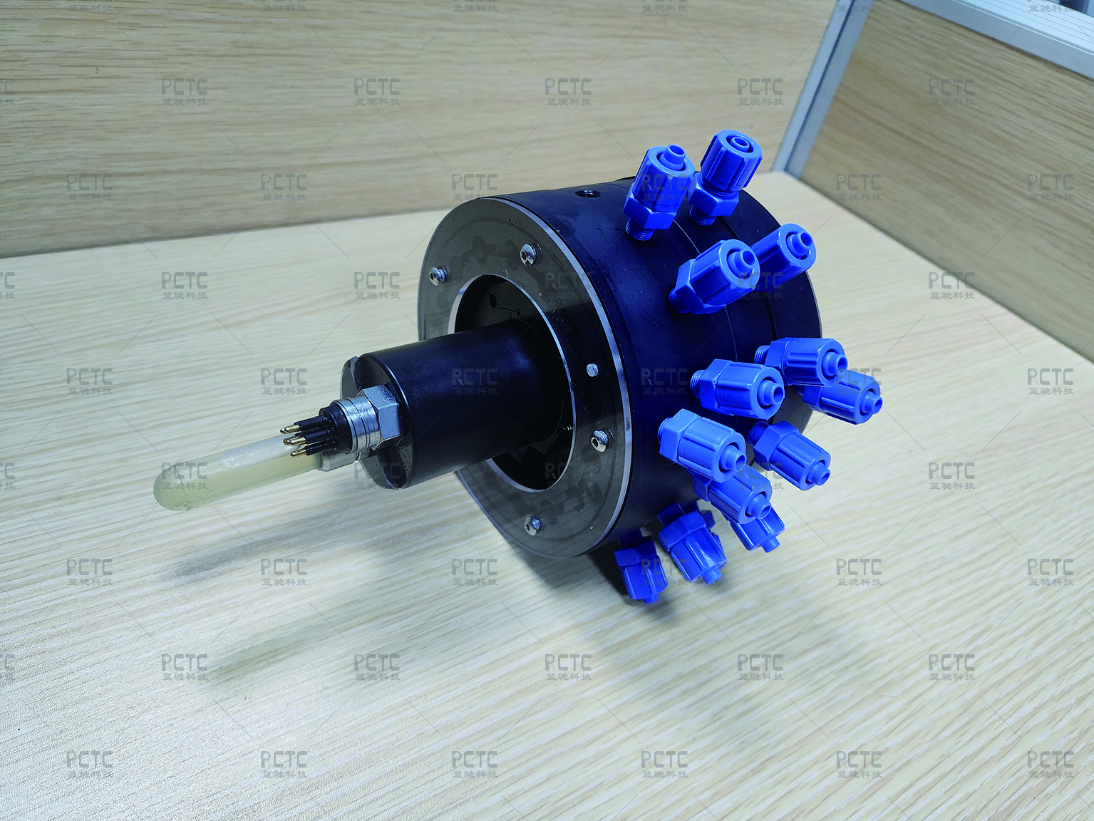 深海多通道阀由一个主通路和多个分路组成,采用转盘式结构,通过阀体转动,实现主通路和分路的连通,阀体由减速电机驱动,电机主轴上装有位置传感器,传感器能够精确反馈阀体位置。在采水或过滤等应用中,主通路连接水泵,分路连接水袋或过滤器,可以一次完成多个样本的采集。